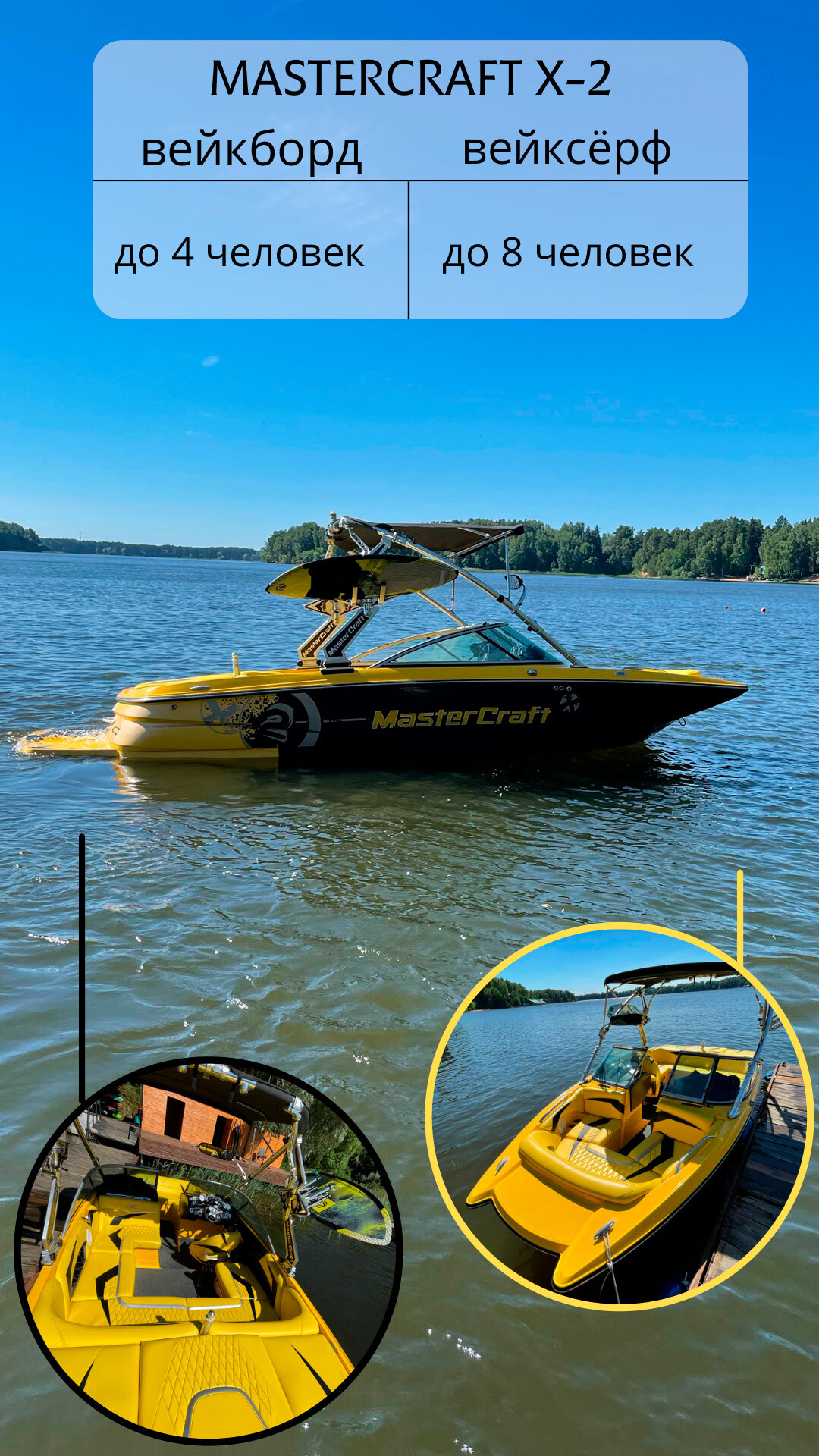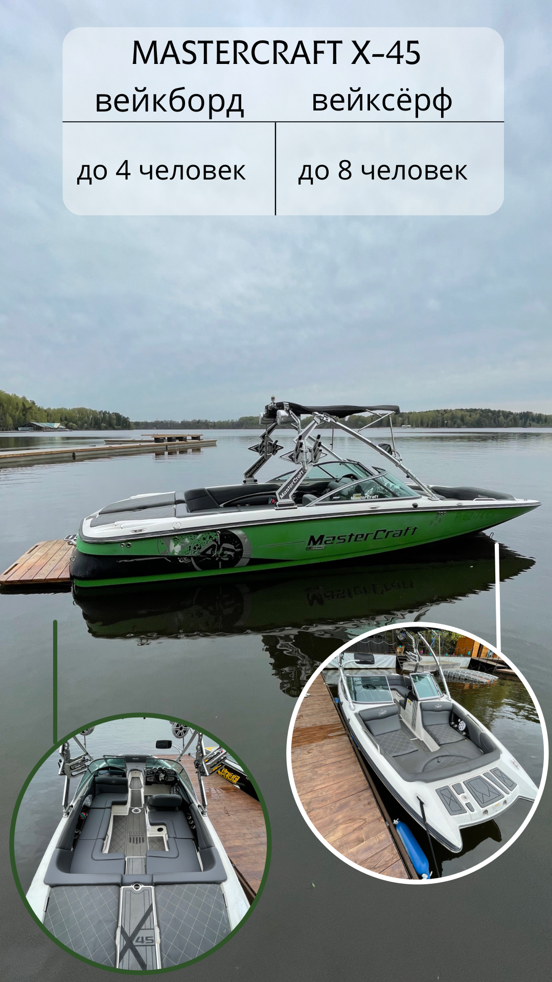 Это профессиональные буксировщики с идеальной волной и мощным двигателем. Вместимостью до 4 человек при катании на вейкборде и до 8 человек при катании на вейксёрфе.